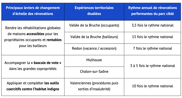 Après avoir rappelé les principaux types de soutiens aux rénovations énergétiques ainsi que les résultats actuels en France et dans 62 agglomérations « moyennes » de 40.000 à 140.000 habitants, la note revient particulièrement sur plusieurs exemples de réussites remarquables dans différents types de territoires. Elle propose ainsi une analyse des principaux facteurs clés expliquant ces résultats très supérieurs à la moyenne nationale.