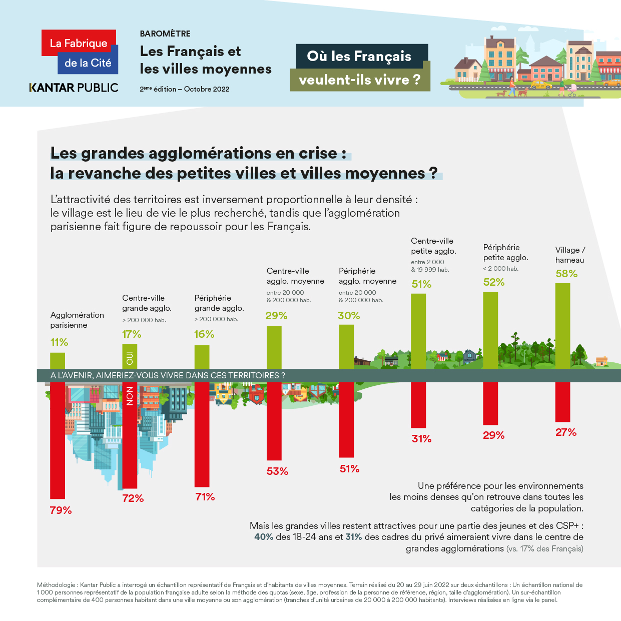 58 % des Français aspirent à vivre dans un village ou un hameau, un phénomène renforcé par la crise de la Covid-19. C’est le résultat de la deuxième édition du baromètre « Les Français et les villes moyennes » produit par Kantar Public pour le compte de la Fabrique de la Cité dans le cadre de ses travaux sur les villes moyennes.