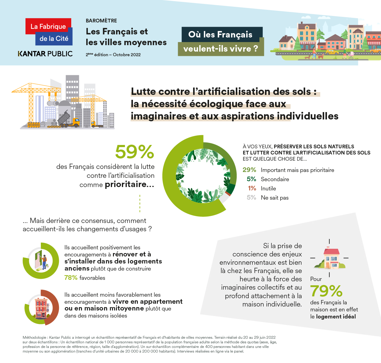 L’artificialisation des sols est un sujet de préoccupation pour les Français qui aspirent à un idéal de vie au calme, dans un environnement naturel et préservé. Un objectif qu’on atteindrait selon eux en limitant les nouveaux projets d’infrastructures ou la construction de centres commerciaux. Il semble en revanche, que pour une grande majorité de la population, renoncer à la maison individuelle ne soit pas une option.