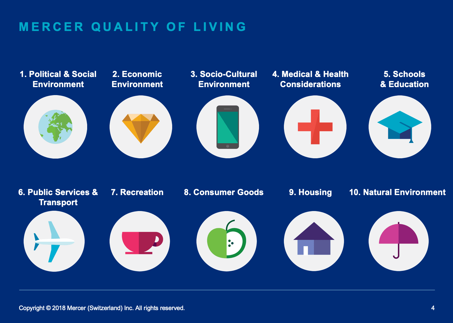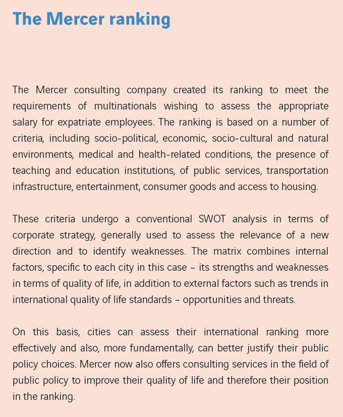 The impact of the rankings therefore exceeds their primary objectives and they have become e?llent instruments for cities’ economic development, as they are used primarily as a powerful local area marketing lever to attract talent. Thomas Madreiter, head of urban development at Vienna city council, confirmed this: “cities are now competing on a global scale to attract the best talent, the best companies and the best researchers…. The Mercer ranking is therefore very important as it enables Vienna to enjoy great visibility on an international level and to be attractive”. Cities also view the rankings as a tool to encourage a positive feeling of belonging and pride among inhabitants that cements the community. However, all rankings are based on a comparison – and all comparisons, if they are correctly used, require us to be aware of their limits: what are we comparing and to what extent is the comparison valid?
