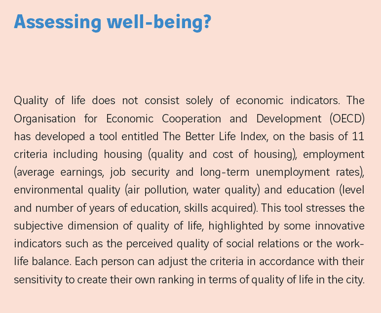 Can quality of life be measured? The existence of reputed rankings and assessments, such as those produced by Mercer or the OECD, point to this conclusion – as their differences indicate that each ranking uses different indicators and weightings. “Measurement institutes do not agree on which measurement tool to adopt”, commented Aziza Akhmouch, Head of the Cities, Urban Policies, and Sustainable Development Division of the OECD. Behind the apparent simplicity of their rankings and their extreme clarity, which are often deftly reworked in local area marketing initiatives (“the top 10 best cities to live in”, “the 20 medium-sized cities which are reinventing quality of life”, etc.), the measurement of quality of life is a major challenge: it has direct repercussions not only on the competitiveness of the cities concerned but also on the definition of public policies. The measurement of quality of life has become an important tool in the steering and management of cities – a tool which is not quite like others due to its reliance on a certain definition, or interpretation, of what quality of life is.