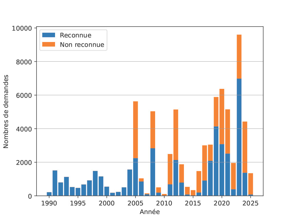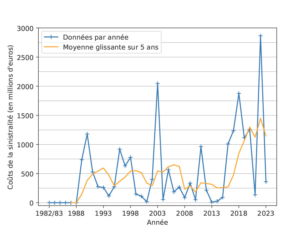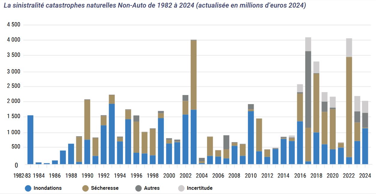 Sur la période 1982-2024, la sinistralité engendrée par les catastrophes naturelles, illustrée dans le graphique ci-dessus, renseigne sur plusieurs points.