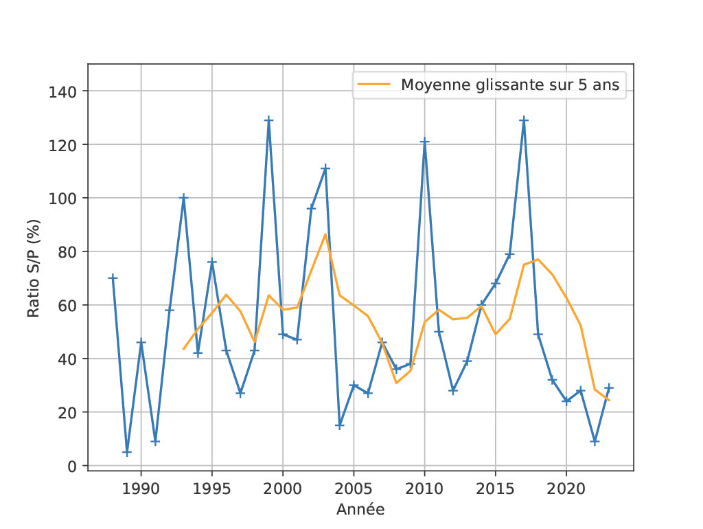 Le ratio S/P correspond au rapport entre les coûts engendrés par les sinistres RGA et les primes récoltées dans la commune.