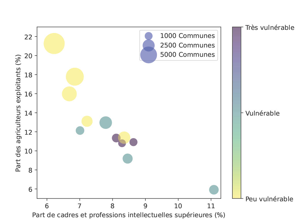 Le graphique suivant laisse penser cette fois à un lien de corrélation inverse entre la part d’agriculteurs dans les emplois et celle de cadres et professions intellectuelles supérieures. Les groupes les moins vulnérables aux inondations sont concentrés dans les franges avec une part élevée d’agriculteurs dans les emplois. À l’inverse les groupes plus vulnérables observent une part de cadres et professions intellectuelles supérieures plus fortes. Ceci informe sur une présence supérieure et donc une exposition au risque inondation de cette classe professionnelle en particulier.