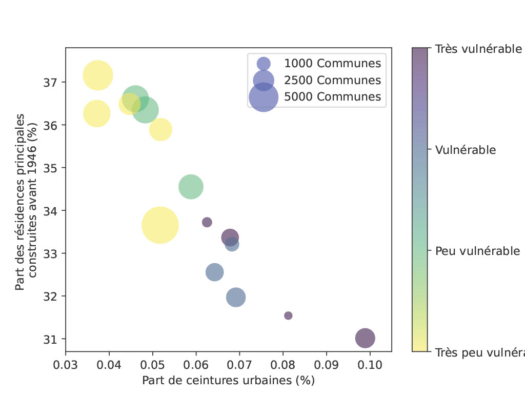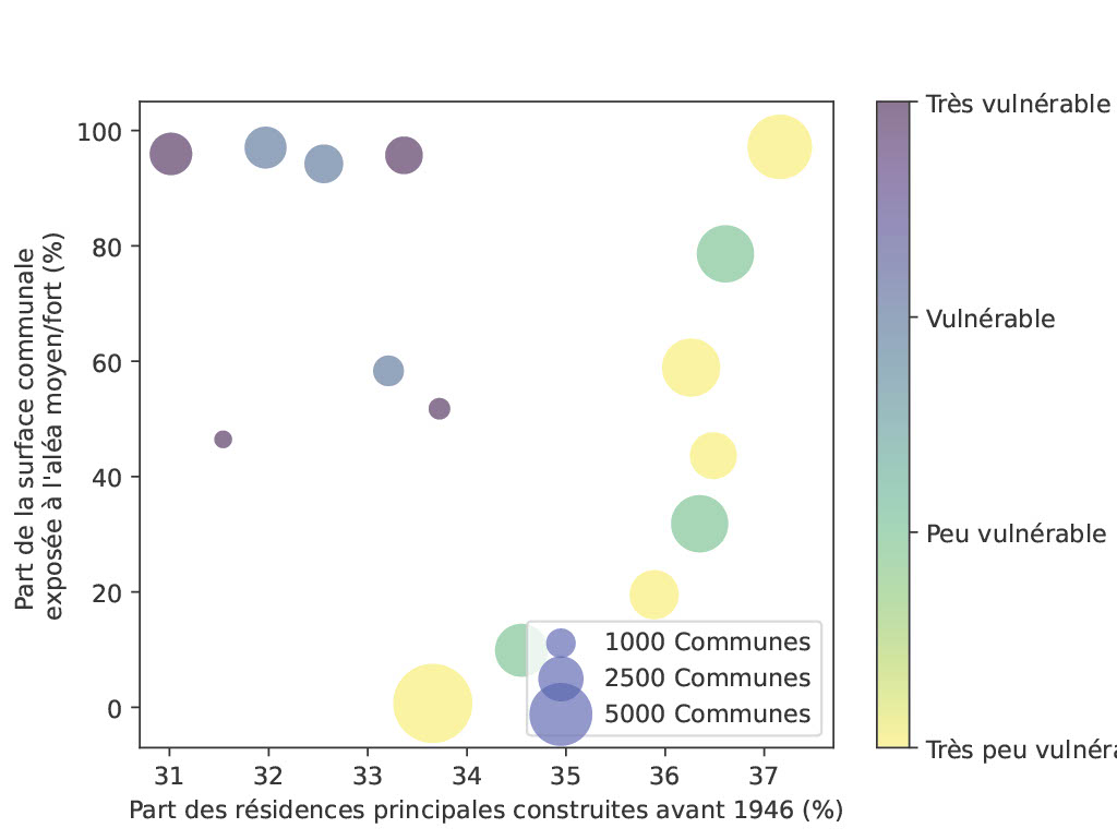 Pour le risque RGA, les observations confirment la fragilité des maisons construites dans la deuxième partie du XXème siècle, avec des dégâts importants sur les communes dont le parc immobilier a été en grande partie construit pendant cette période. Les employés et les professions intermédiaires sont significativement présents dans les communes les plus vulnérables, la part de ceintures urbaines semble également augmenter avec le risque. Ces deux observations mériteraient d’être approfondies pour potentiellement déceler un lien socio-économique très utile à l’élaboration des politiques publiques sur le sujet.