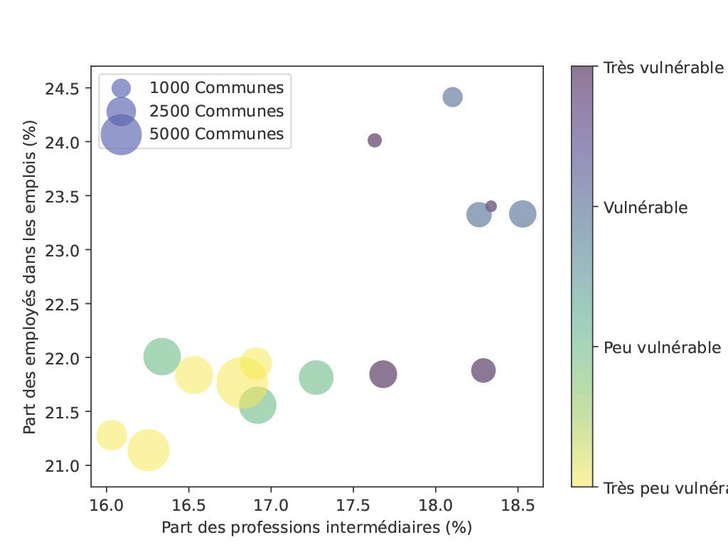 Un autre graphique fait apparaître un lien de corrélation inverse entre la part de personnes peu ou non diplômées dans la population et la part de diplômés niveau bac+5. Ce lien met en avant une exposition plus importante des profils hautement diplômés. La représentation de la part d’employés en fonction de la part des professions intermédiaires indique une proportion importante de ces professions dans des groupes de communes vulnérables et très vulnérables, à l’inverse ils sont moins présents que la moyenne dans les groupes très peu exposés. Cette observation entre en accord avec l’étude de T. Bézy54 sur les budgets des familles dans laquelle les monopropriétaires55 dans le milieu de la distribution de revenus semblent particulièrement plus exposés à ce risque. Cette classe de la population pourrait correspondre aux employés et professions intermédiaires ayant accédé à la propriété à travers les grands ensembles pavillonnaires des ceintures urbaines. Une étude spécifique sur le sujet pourrait être réalisée pour fortifier ce résultat.