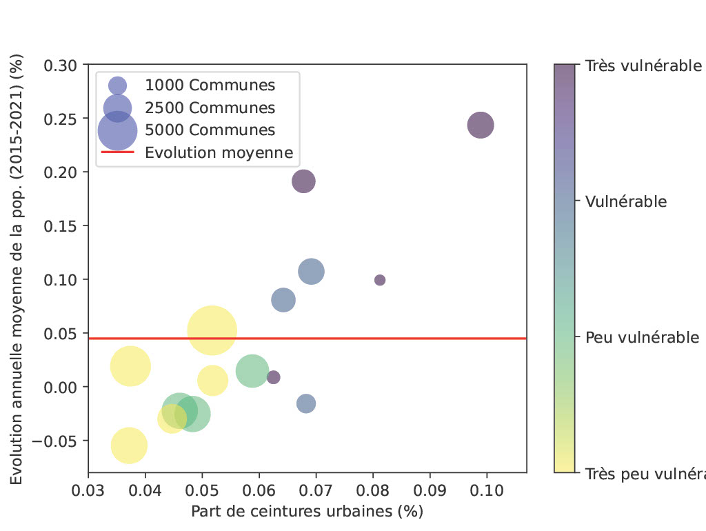 Évolution annuelle moyenne de la population (2015-2021) dans chaque groupe de communes en fonction de la part de ceintures urbaines.