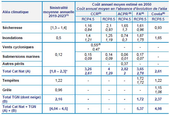 D’un point de vue coût assurantiel, le tableau suivant publié dans le rapport du Haut-Commissariat à la Stratégie et au Plan (HCSP) décrit les résultats des différentes études sur l’évolution des coûts des sinistres. Malgré une période de référence (2019-2023) marquée par une sinistralité élevée, les prévisions avancent des coûts moyens significativement plus élevés pour les inondations. Les projections pour les RGA sont moins claires mais annoncent également une forte augmentation sous le scénario RCP 8.5 à horizon 2050. Les incertitudes autour de ces projections restent toutefois importantes et invitent avant tout à réfléchir aux grandes tendances en cours et à venir.