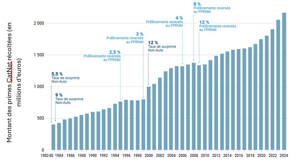 Suivi de l’évolution des primes CatNat récoltées sur la période 1982-2024 (CCR)