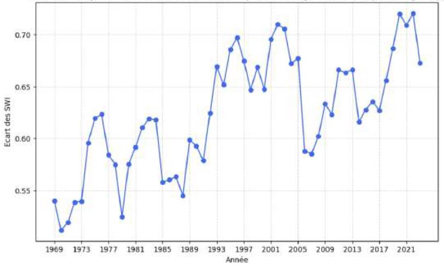 Ce déséquilibre financier semble donc provenir de la part croissante des sinistres RGA dans les coûts des catastrophes naturelles. Or, les dégâts causés par les RGA présentent une particularité par rapport aux autres aléas naturels du régime : une cinétique lente19 avec des effets susceptibles de se manifester pendant des périodes sèches qui n’entrent cependant pas dans la catégorie sécheresse. Les cycles saisonniers habituels engendrent des pressions importantes sur les bâtiments et particulièrement sur les maisons individuelles avec des fondations peu profondes. Les dégâts de RGA sont donc principalement causés par « une inadaptation dans la conception et/ou la réalisation des fondations »20. Au XIXème siècle et au début du XXème, les fondations en maçonnerie étaient utilisées pour les fondations superficielles et présentaient une élasticité importante ce qui les rendaient adaptables face aux RGA. À partir de la seconde moitié du XXème siècle, des fondations en béton sont adoptées pour les maisons classiques. Bien qu’elles soient plus profondes et plus résistantes, elles deviennent également plus vulnérables aux épisodes de sécheresse qui engendrent des mouvements importants et donc des désordres plus sévères à cause d’une concentration des forces sur les fondations21. Les épisodes de sécheresse à répétition ces dernières années se retranscrivent dans les indices d’humidité des sols qui montrent une légère tendance à l’augmentation de l’écart entre période sèche et humide. Ce phénomène se distingue clairement des autres aléas naturels dans plusieurs dimensions : son poids dans l’augmentation récente des coûts, sa cinétique lente, et son lien intrinsèque avec les modes de construction qui pourrait réduire hautement la charge des sinistres par des méthodes de prévention et d’adaptation22.