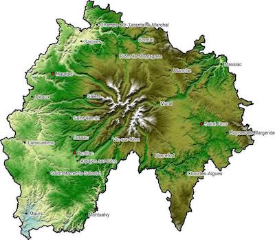 Aurillac est souvent qualifiée de ville- préfecture la plus enclavée de France1. Le département du Cantal présente la particularité topographique d’être dominé par le plus grand stratovolcan d’Europe2, le Puy-Mary (2800km², soit deux fois la surface de l’Etna), qui contraint fortement les relations est-ouest à l’intérieur du département ainsi que les relations avec les autres villes hors du département (Fig.1). La plupart des villes du Cantal, Pierrefort, Saint-Flour, Murat, Riom-es-Montagne,Mauriac, Pleaux, Salers ainsi qu’Aurillac, se trouvent à l’extrémité des coulées volcaniques. Aurillac se situe dans un bassin sédimentaire riche à l’intersection de plusieurs unités paysagères d’une richesse e?ptionnelle : on trouve à l’est le Massif cantalien du Puy-Mary, au sud et au sud-ouest, deux plateaux volcaniques (Châtaignerie et Xaintrie). Aurillac commande surtout l’accès aux larges vallées glacières de la Jordanne et de la Cère, historiquement les principales voies traversantes de la montagne en direction notamment de la vallée de l’Allier. La vallée de la Cère est aujourd’hui empruntée par la seule voie d’importance nationale, la N122, permettant de rejoindre l’ouest et l’est du département, et de là, Clermont-Ferrand.
