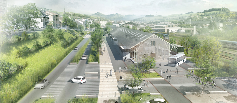 De plus, les liaisons entre les différents modes de transports n’étant pas assez développées, l’interconnectivité du réseau reste insuffisante. Pour améliorer les services de transport, la communauté d’agglomération du Bassin d’Aurillac (CABA) met ainsi actuellement en œuvre le projet du Pôle d’Echange Intermodal (PEI) dans le quartier de gare (cf. fig.6). Celui-ci doit être opérationnel en 2022. Le premier objectif du PEI est de « permettre de passer d’un mode de transport à l’autre dès début 2022 : du train à la voiture, du car au covoiturage ou au vélo, » explique Sébastien Prat, Vice-Président en charge des mobilités et transports urbains à la CABA. « Ce projet [doit] permettre de structurer [le] futur schéma de mobilité au service des habitants du territoire22 » et de capitaliser sur une possible amélioration future de la desserte ferroviaire. L’ambition est de faire du quartier de gare à la fois un vecteur de développement de mobilité décarbonée (navette électrique, bornes de recharge électrique et hydrogène, aménagement de pistes cyclables et de voies piétonnes, développement de services numériques etc.) et un carrefour de rencontres qui puisse servir de nouveau lieu de vie pour les habitants et pas seulement de hub de transport. A cet effet, l’Atelier Georges a proposé un véritable projet architectural23.