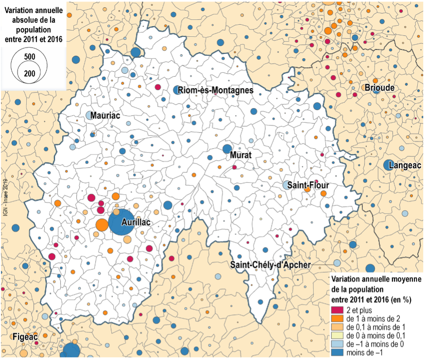 Ainsi les communes les plus proches d’Aurillac comme Ytrac, Saint-Paul-des-Landes, Sanssac-de-Marmiesse ou Vézac ont connu une croissance démographique de 1% à 2% entre 2011 et 2016, et plus encore les petits bourgs ruraux un peu plus éloignés comme Labrousse, Carlat ou Ayrens (+ de 2%)19.