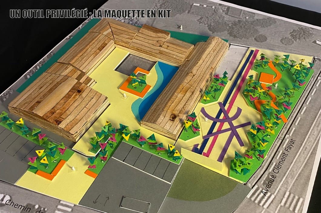 Pour transformer cet espace largement minéral, avec très peu d’arbres, la Ville et l’atelier CLAP ont travaillé sur un cahier des charges en concertation avec les équipes enseignantes, les agents municipaux (entretien et périscolaire) et les parents. Des ateliers ont été organisés, d’abord en plénière, puis séparément selon les acteurs, avec des maquettes afin d’imaginer et de travailler au placement des différents éléments. L’atelier avec les enseignants a permis d’aborder en profondeur la dimension pédagogique de la cour : un travail sur la saisonnalité et la biodiversité a été effectué, autour de fiches permettant une bonne appropriation de l’espace.