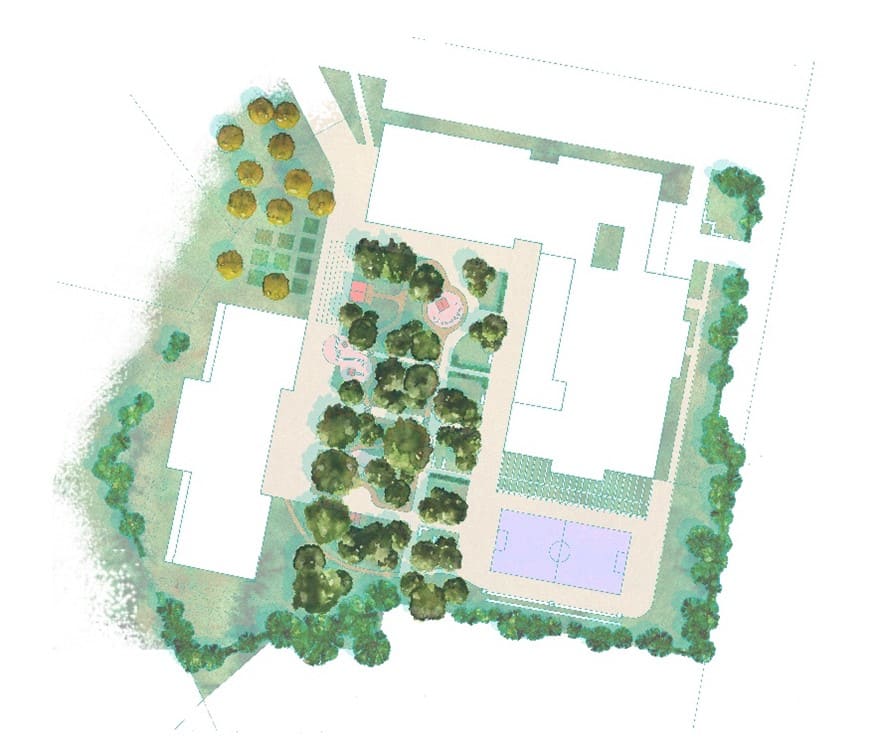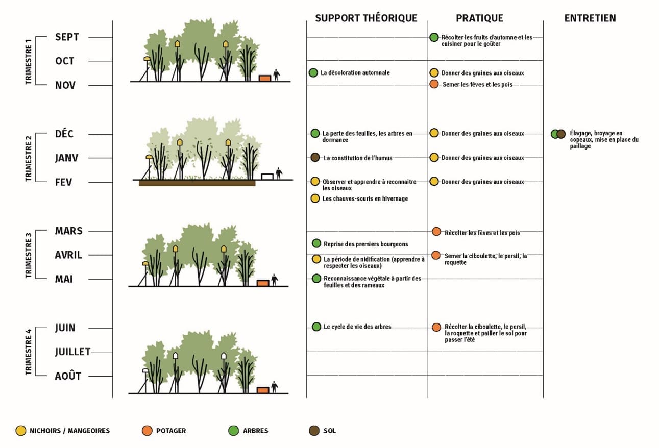 Pour que les enfants puissent occuper cet espace selon leurs envies, le mobilier installé est sans fonction précise et ne surdétermine pas les usages qui pourront en être faits. Ce sont des blocs de bois, modulables, qui peuvent être tantôt des bancs, des scènes, des lits ou une « montagne magique ». Une « brigade des feuilles » a été mise en place : elle a pour mission de collecter les feuilles tombées des arbres pour les composter, un compost qui servira ensuite à fertiliser les espaces végétaux. Ce sont donc les enfants eux-mêmes qui apprennent à prendre soin de leur espace de vie. Au sol, un revêtement perméable a été installé pour réduire l’effet d’îlot de chaleur. Des lanières d’arbres ont aussi été plantées le long des bâtiments, pour réduire l’exposition directe des murs au soleil et limiter la chaleur ressentie à l’intérieur.