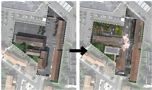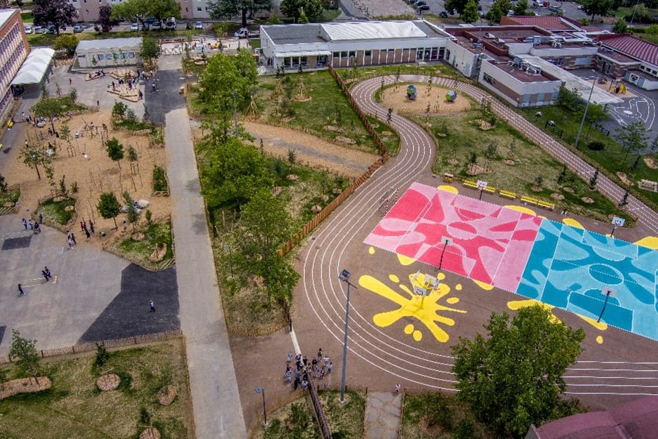 La nouvelle « cour-parc » s’articule avec des mesures d’adaptation du bâti scolaire, notamment l’application de peinture blanche sur les toitures, la pose de déstratificateurs d’air – dispositifs qui rabattent l’air chaud naturellement accumulé au plafond vers le reste de la pièce, pour, l’hiver venu, accroître le confort thermique sans chauffage supplémentaire – et de stores solaires. Parallèlement, le programme « Dessine-moi ta cour » a été proposé aux élèves pour imaginer et s’approprier l’espace de la cour de récréation. Ce sont les enfants qui pensent la végétalisation et la déminéralisation de l’espace scolaire extérieur. Il porte sur trois groupes scolaires de la commune, cinq ateliers ont été organisés avec les 300 élèves de l’école Jules Ferry. Elle compte à présent un plateau sportif, 132 arbres supplémentaires, des espaces de jeux et un jardin pédagogique. Les objectifs de ce réaménagement sont, au premier chef, le développement d’espaces végétalisés et la gestion à la parcelle des eaux pluviales, avec la désimperméabilisation de 70 % de la surface. La porosité du sol permet d’éviter aux eaux pluviales de ruisseler et de saturer les réseaux d’assainissement en infiltrant directement ces eaux dans le sol44.