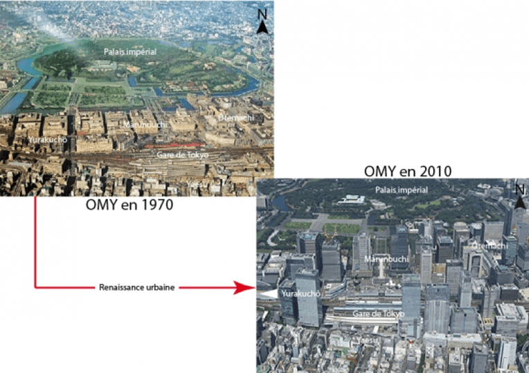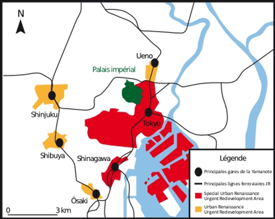 Le deuxième objectif était de parachever près de vingt ans d’intense politique de renaissance urbaine des grandes métropoles nippones, Tokyo en tête. Initiée en 2002 et relancée en 2011, la renaissance urbaine est une ambitieuse politique du gouvernement central destinée à améliorer le bâti, les infrastructures et la valorisation foncière des cœurs métropolitains japonais durement touchés par plus de dix ans de récession économique – la « décennie perdue » des années 1990 – qui succèdent à l’éclatement de la bulle financière de la fin des années 1980. L’idée principale était alors de relancer l’attractivité et la compétitivité métropolitaine en injectant dans le design urbain des milliers de milliards de yens, dont une part significative provenait d’investissements privés – principalement les grandes entreprises immobilières des principaux conglomérats nippons (Mitsubishi Real Estate, Mistsui Real Estate, Mori Biru…) et des compagnies ferroviaires privées (figures 1 à 3).