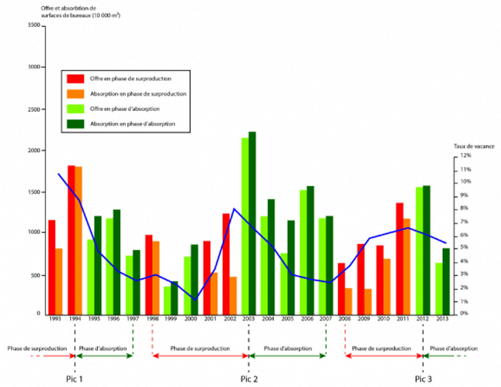 Dans le détail, chaque cycle de neuf ans est constitué de deux phases (figure 11). Prenons le cas du deuxième cycle. Avant 2003, l’offre est bien supérieure à la capacité d’absorption du marché qui connaît une situation de surproduction. Après 2003, l’offre baisse, la demande la rattrape puis la dépasse. Les livraisons de surfaces nouvelles diminuent, ce qui permet une absorption des surfaces existantes par le marché. On observe ainsi que les rapports entre l’offre et la demande s’inversent après 2003.