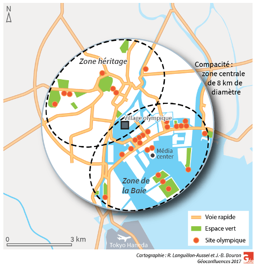 Les concepteurs du projet de Tokyo 2020 ont voulu insister sur trois points majeurs : la compacité, la centralité et l’héritage urbain. À l’échelle du pays, 28 des 37 sites olympiques du projet de 2020 se situent dans le centre de Tokyo, dont 21 sur le front de mer : cette logique de forte concentration relève donc, spatialement, d’une volonté de renforcer la centralité tokyoïte aussi bien à l’échelle nationale que régionale et métropolitaine, reprenant par-là la même logique que celle du zonage des années 2000 et celui des années 2010.