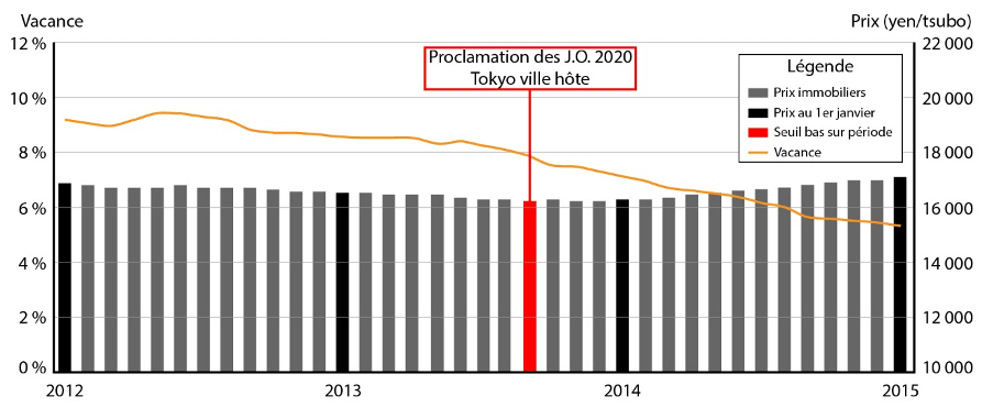 Néanmoins, malgré l’observation de ces éléments concernant la dynamique des prix fonciers et immobiliers, les taux de vacance qui diminuent ou encore la multiplication de projets de grande taille, il demeure difficile d’évaluer avec précision ce qui relève de l’événement ponctuel, à savoir l’attribution des Jeux à Tokyo en septembre 2013, ou du cycle macro-économique dont les dynamiques expliquent déjà à elles seules le pic de livraison de surfaces immobilières commerciales en 2012, le pic des taux de vacances en 2011 et leur décroissance continue et le plancher des prix immobiliers en 2013 et leur hausse continue.