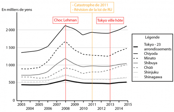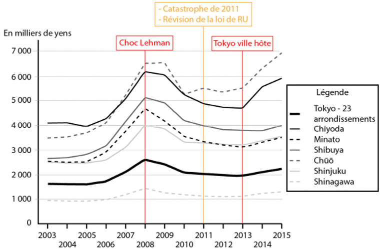 L’évolution des prix fonciers commerciaux et résidentiels sur l’ensemble de la période (2003-2015) permet également de reconstituer une dynamique dans laquelle 2013 occupe un statut charnière(figures 8 et 9). L’année 2008 constitue dans les deux cas un pic en termes de valeur, avant que le choc Lehman Brothers et la crise internationale n’enclenchent une dynamique déflationniste. Dans la plupart des cas, le plancher des prix (résidentiels comme commerciaux) est justement atteint en 2013, qui ouvre une période de net renchérissement général, tant à l’échelle des vingt-trois arrondissements qu’au niveau de la plupart des arrondissements centraux (Minato, Shibuya, Shinjuku et Shinagawa). Deux arrondissements néanmoins présentent un petit écart : il s’agit des deux plus centraux, Chiyoda et Chūō, aussi parmi les plus concernés à la fois par la politique de renaissance urbaine et ses zonages successifs et par les aménagements des sites olympiques. Pour les prix résidentiels, ces deux arrondissements, ne connaissent pas un plancher en 2013, mais en 2010, avant de remonter en 2011, puis de redescendre en 2012 à la suite du séisme qui a liquéfié les terrains construits sur le front de mer et affecté négativement la perception de leur sécurité, puis de remonter à partir de 2013 avec l’annonce des Jeux olympiques.