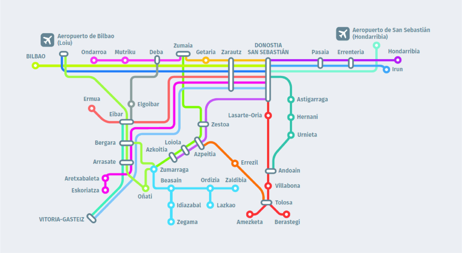 En 1979, les statuts de Guernica établissent que la communauté autonome du Pays basque a la compétence exclusive sur les chemins de fer, transports terrestres, maritimes, fluviaux, ports, héliports, aéroports assurant des dessertes dont l’origine / destination se situe au Pays basque.