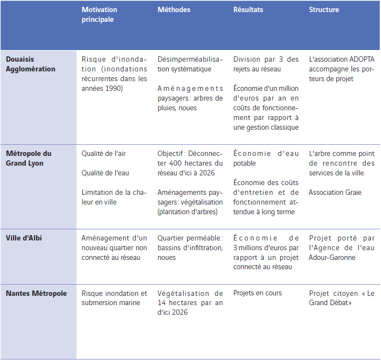Cette synthèse démontre qu’une diversité de villes françaises s’emparent de ces sujets. Pour autant, la « ville perméable » demeure du sur-mesure, à partir des motivations principales (risque inondation, sécheresse, qualité de l’air ou de l’eau, etc) et de l’organisation au sein même des collectivités.