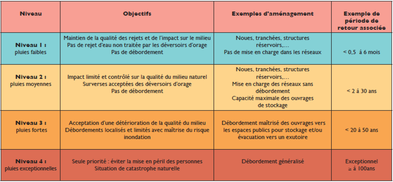 Crédits du tableau : Choix de niveau de services et ouvrages de désimperméabilisation (Office international de l’eau, 2014)