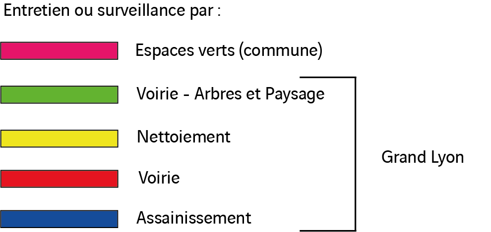 Les appels d’offres pour les aménagements urbains sont eux aussi trop sectoriels (espaces verts, voirie) et limitent généralement l’échange entre les différents services autour du projet. Cependant, il arrive que les services concernés par une gestion intégrée des eaux pluviales soient divisés entre Ville et Métropole, ce qui rend complexe la réalisation des projets et l’entretien des dispositifs. Par exemple, à Lyon, comme le démontre l’image ci-dessous, les espaces verts sont gérés par la Ville, et la voirie par la Métropole. Parallèlement, la Métropole regroupant 58 communes, elle ne peut pas lancer des projets d’ampleur sans l’accord et l’action des élus de chacune de ces communes.
