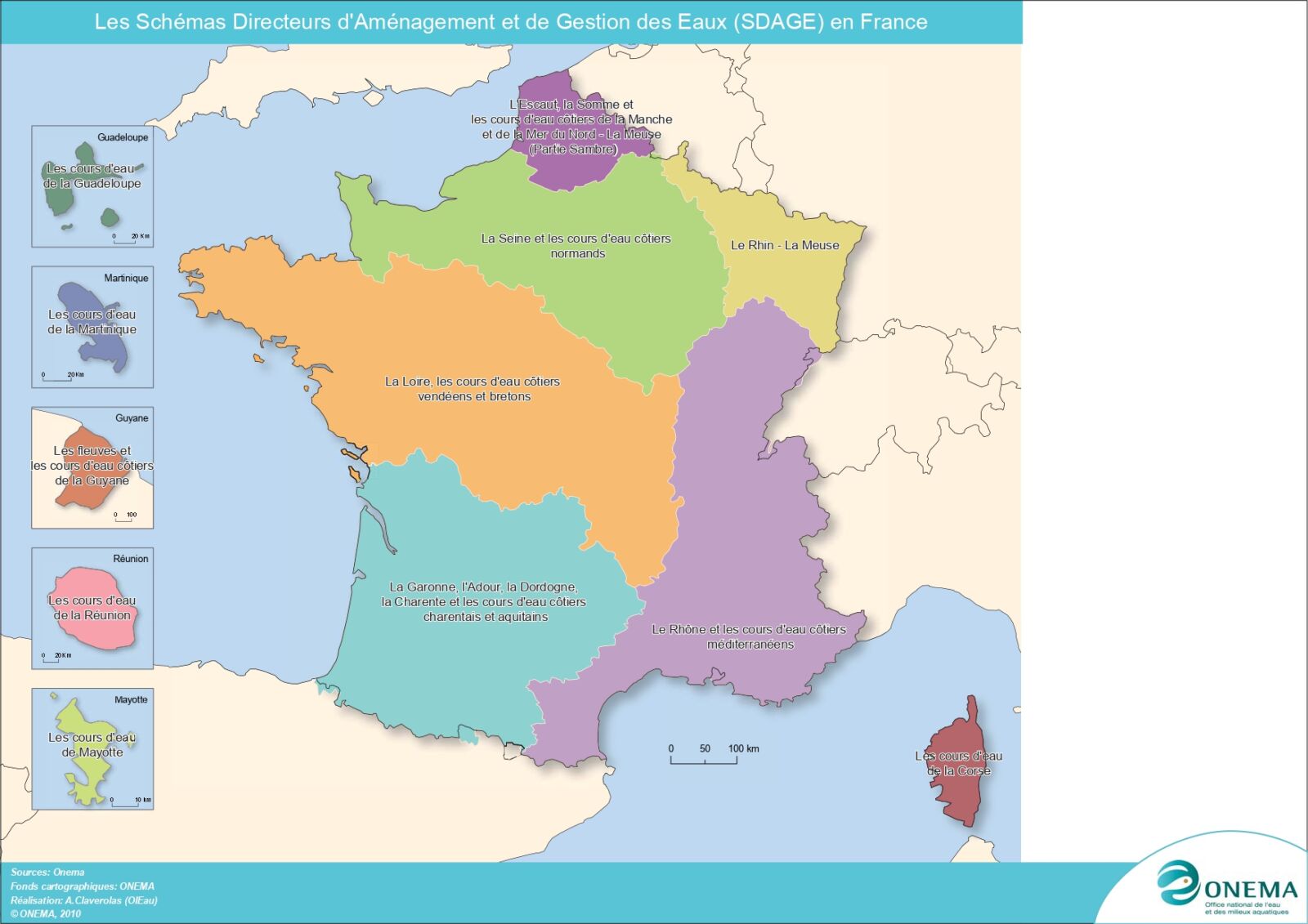 Schémas explicatifs de la répartition des SDAGE (à gauche) et des SAGE (à droite) en France. Source : Gest’eau