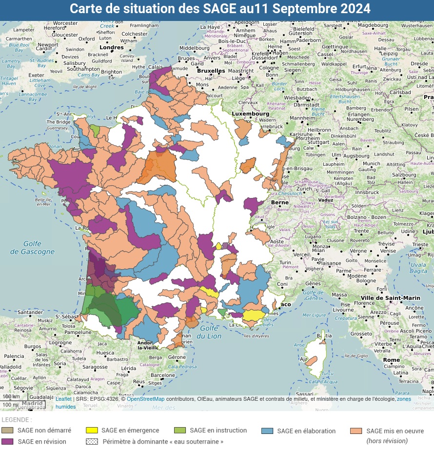 Les SDAGE sont ensuite déclinés localement – au niveau d’un bassin versant ou d’une nappe – en schémas d’aménagement et de gestion des eaux (SAGE) qui ont pour mission, à partir des spécificités territoriales, de concilier la satisfaction et le développement des différents usages (eau potable, industrie, agriculture) et la protection des milieux aquatiques. Le SAGE, lui, repose sur une démarche volontaire de concertation avec les acteurs locaux. En 2024, 202 SAGE ou projets ont été recensés dans le pays. Les commissions locales de l’eau (CLE) sont chargées d’élaborer de manière collective, de réviser et de suivre l’application du SAGE. La CLE est présidée par un élu local et constituée des collectivités territoriales, leurs groupements et établissements publics locaux, des usagers (agriculteurs et industriels), des organisations professionnelles et associations et de l’État.