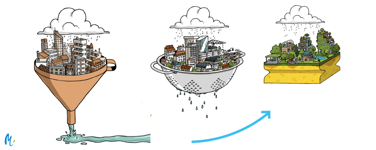 Il apparaît donc intéressant que les territoires s’approprient les eaux pluviales comme une véritable ressource à utiliser et valoriser, d’autant plus qu’on sait qu’on en manquera. C’est la promesse de la « ville perméable » : si l’on ne peut pas agir sur la localisation ou l’intensité de la pluie, on peut faire en sorte qu’elle s’infiltre là où elle tombe, pour en récupérer les bienfaits.