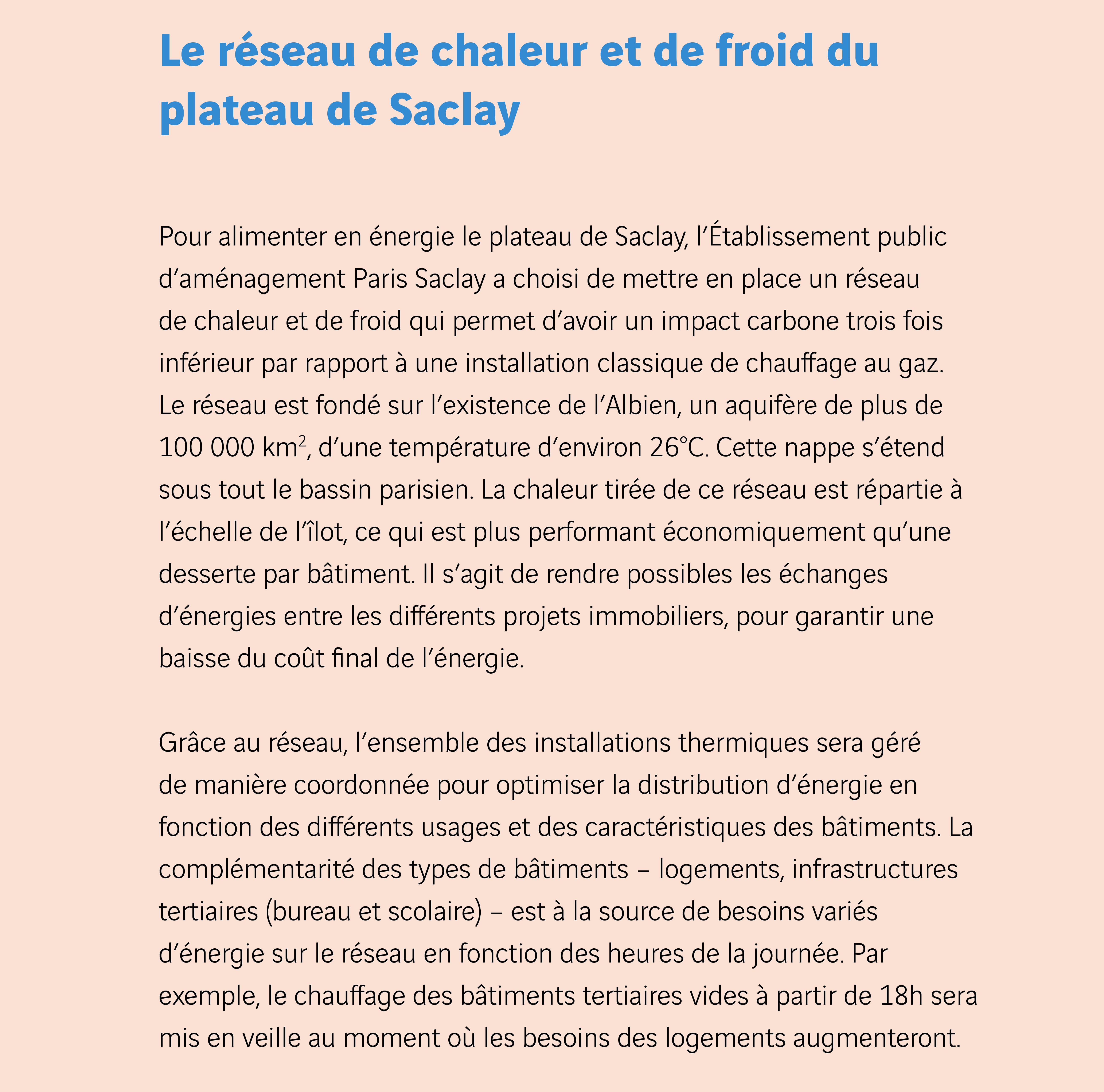 Les modèles actuels de réseaux de chaleur et de froid n’ont heureusement plus rien à voir avec ceux des années 1970-80. À l’époque, les usagers étaient captifs d’un réseau organisé et fixe ; aujourd’hui, les systèmes s’incrémentent, se développent et fonctionnent par le biais de demande de raccords au réseau. Il est désormais possible de penser les systèmes à plus petite échelle en les construisant autour de productions décentralisées et de systèmes semi-fermés ou fermés, comme par exemple sur le plateau de Saclay1. Dans ce contexte, la coopération entre les acteurs devient essentielle.