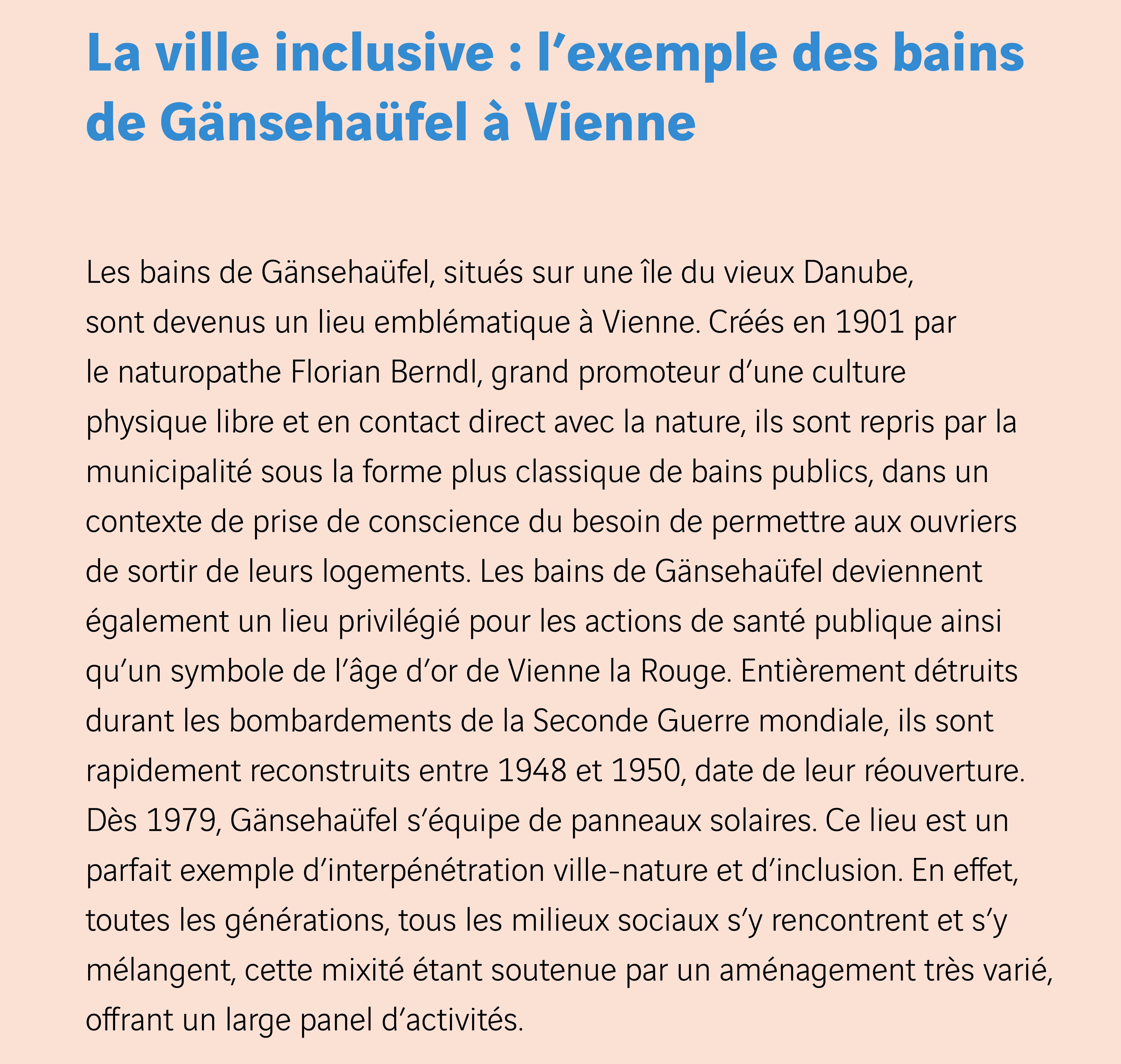 L’enjeu des villes en transition est de pouvoir reconstituer des communautés sensibles grâce à la qualité de l’espace public. Il faut que les habitants puissent occuper l’espace public et s’y exprimer. Pour cela, il est essentiel de restaurer le lien entre le vécu et le vivant. Ce lien implique de nouvelles alliances entre projets urbanistiques et démocratiques planifiés et initiatives spontanées et créatives des habitants. Certains lieux en offrent une parfaite illustration, comme le canal du Danube, haut lieu de l’urbanité viennoise, tout à la fois participative et inclusive : chacun s’y rend et peut laisser libre cours à sa créativité et s’y exprimer, notamment par l’intermédiaire de graffitis. Les pouvoirs publics l’ont compris et participent à cette dynamique en s’abstenant d’effacer les tags, les murs du canal étant considérés comme un espace de libre expression.