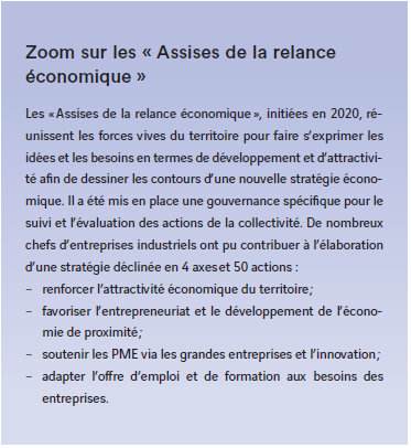 Positionnée en Bourgogne Franche-Comté, région comprenant la part la plus importante de France de l’emploi industriel dans l’emploi salarié régional (données Insee), l’industrie du territoire a su à la fois conserver ses secteurs traditionnels, notamment la métallurgie, et muter vers des secteurs de pointe. Elle est polarisée autour de trois grands secteurs : l’énergie, la sidérurgie, les transports, et marquée par la présence de nombreuses grandes entreprises. « C’est une ville moyenne avec de grands noms de l’industrie » souligne David Marti. Beaucoup de grands groupes internationaux sont implantés sur le territoire. Ainsi, 20 % des emplois salariés dépendent d’un siège social à l’étranger, contre 13 % en moyenne en Bourgogne. Ces trois secteurs génèrent à eux seuls une importante activité, mais de nombreux autres secteurs sont actifs, comme celui de la construction par exemple, avec le groupe Matière11. Outre les grandes entreprises, de multiples très petites entreprises (TPE) et petites et moyennes entreprises (PME) font partie intégrante de l’écosystème économique du territoire, en tant que sous-traitants ou prestataires. Cet écosystème est renforcé par la volonté des entreprises, y compris internationales, de travailler avec les structures locales, notamment pour des raisons de confiance et de délais. Par ailleurs, ces filières se sont structurées au sein du territoire, notamment autour de zones d’activités et grâce à la création de clusters.