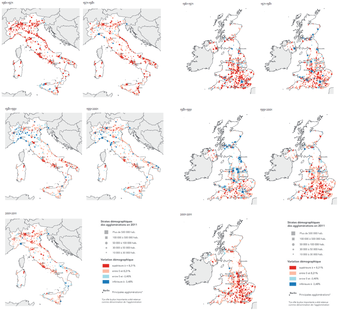 L’Italie et le Royaume-Uni ont connu une période de déclin accentué dans les années 1980 et 1990 pour la première, et dans les années 1970 et 1980 pour la seconde. En Italie, le phénomène a concerné des villes petites et moyennes situées essentiellement dans les régions du nord, en Lombardie, Ligurie ou Vénétie, et plus marginalement dans le sud ; au Royaume-Uni, le déclin a concerné principalement les villes industrielles de toutes tailles ainsi que Londres. Dans les deux pays, la tendance s’inverse dès les années 1990 avec un phénomène de croissance urbaine concernant toutes les strates, même des villes relativement isolées, notamment en Italie. Les quelques villes en déclin sont le plus souvent petites et se concentrent dans le sud de l’Italie, dans les Midlands, dans l’ouest de l’Écosse et dans le nord de l’Irlande.