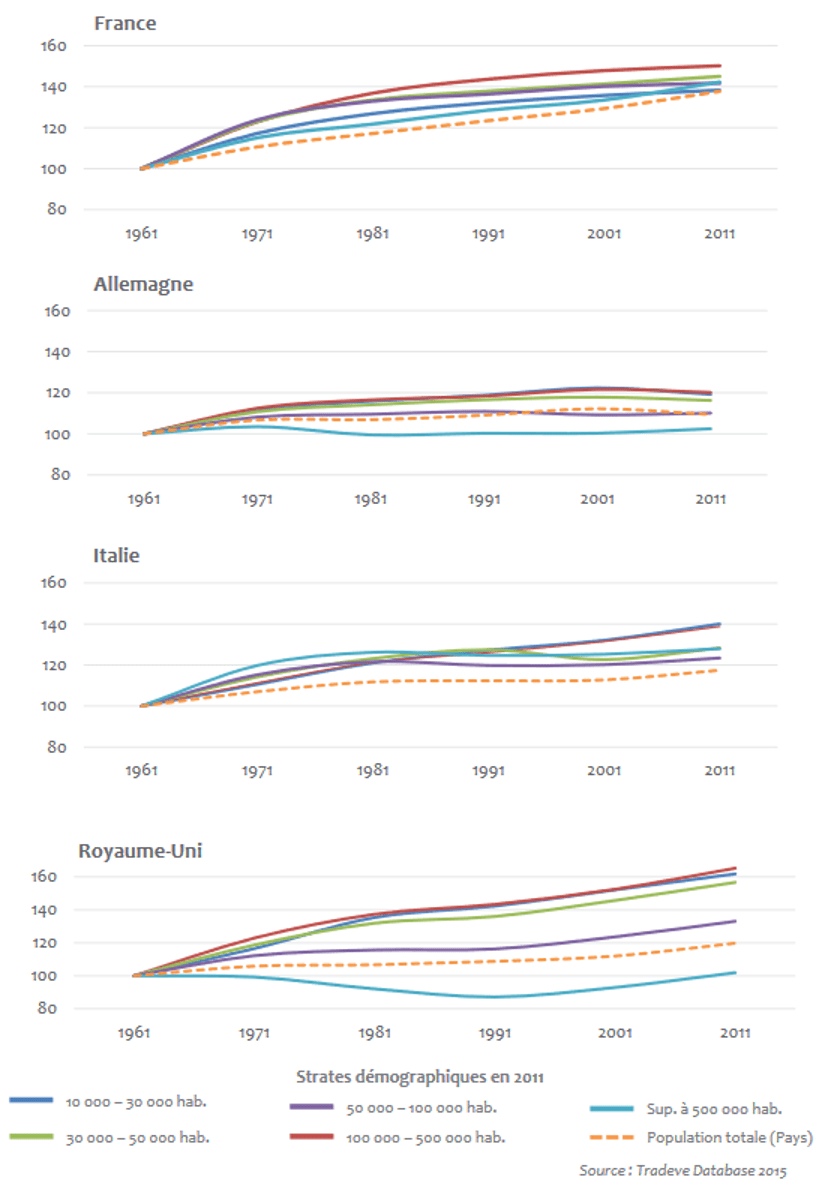 Les cartes montrant l’évolution du nombre d’habitants dans les villes, par pays et par strate dressent un portait plus nuancé des trajectoires des villes moyennes. En France, après une période de croissance concernant l’ensemble des strates dans les années 1960, des évolutions plus contrastées s’affirment dès les années 1970. Certaines villes petites et moyennes entament une phase de déclin qui ne va plus s’inverser. Il s’agit des villes liées à une mono-industrie en perte de vitesse, comme dans le Nord et le Pas-de-Calais (Valenciennes, Lens) ou en Lorraine (Epinal, Forbach) et dans les franges du Massif Central (Roanne). À partir des années 1980, le phénomène de déclin s’élargit à d’autres villes industrielles petites et moyennes (celles de la décentralisation industrielle dans le bassin parisien) et commence à faire apparaître une large diagonale du vide, s’étendant du nord et de l’est vers le centre ouest. Des territoires dynamiques constitués de villes petites et moyennes se dessinent autour des plus grandes villes, qui elles-mêmes maintiennent une croissance soutenue sur toute la période (Arcachon, Villefranche-sur-Saône). Les villes littorales profitent également de cette dynamique positive, principalement sur le pourtour méditerranéen (Fréjus Saint-Raphaël, Narbonne, Vannes), tout comme celles qui sont tirées par une activité économique performante ou diversifiée (Orléans, Niort, Besançon) ou par des fonctions de centralité importantes pour la région (Chambéry comme carrefour au cœur du sillon alpin, pôle industriel (énergie solaire, ingénierie de la montagne), et centre universitaire et de recherche notamment).
