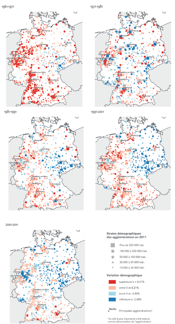 En Allemagne, les contrastes sont extrêmement frappants et s’expliquent par deux facteurs principaux : le vieillissement de la population, qui est à l’origine du ralentissement généralisé de la croissance des villes, et la division puis la réunification de l’Allemagne, qui a fonctionné comme une pompe aspirante au profit des bassins d’emploi des Länder de l’ouest. Ce phénomène a encore accentué le vieillissement et le déclin des villes des Länder de l’est. Les cartes font apparaître d’autres clés de lecture : l’une d’entre elles est celle de la vitalité des bassins d’emplois structurés autour d’une métropole dynamique (Stuttgart, Düsseldorf, Munich…) et d’un semis très dense de villes petites et moyennes qui fonctionnent en réseaux ; une autre, plus récente, est celle d’un phénomène de déclin qui concerne des petites villes situées dans les Länder de l’ouest, jusqu’aux franges des bassins d’emploi très dynamiques (Bavière, Bade-Wurtemberg). Cette dynamique se double d’une inversion de tendance dans les Länder de l’est, avec une attractivité renouvelée des plus grandes villes comme Berlin, Leipzig ou Dresde.