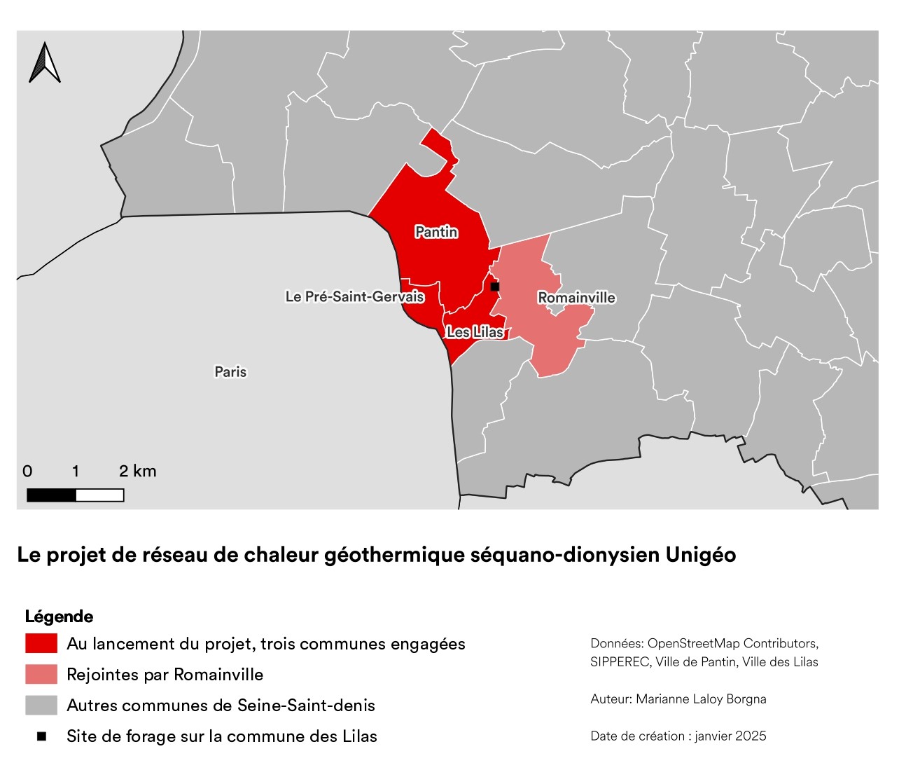 Le SIPPEREC a relancé une dynamique autour de la géothermie dans les années 2010, et le forage réalisé en 2015 pour un réseau sur les communes de Montreuil, Rosny-sous-Bois et Noisy-le Sec a confirmé le potentiel de la zone. Le SIPPEREC propose fréquemment un accompagnement et une mutualisation autour de ces projets, afin de bénéficier de son expertise technique et d’économies d’échelle. Dans le cas d’Unigéo, la coopération est d’autant plus simple que les maires partageaient la même vision du service énergétique à mettre à disposition des populations.