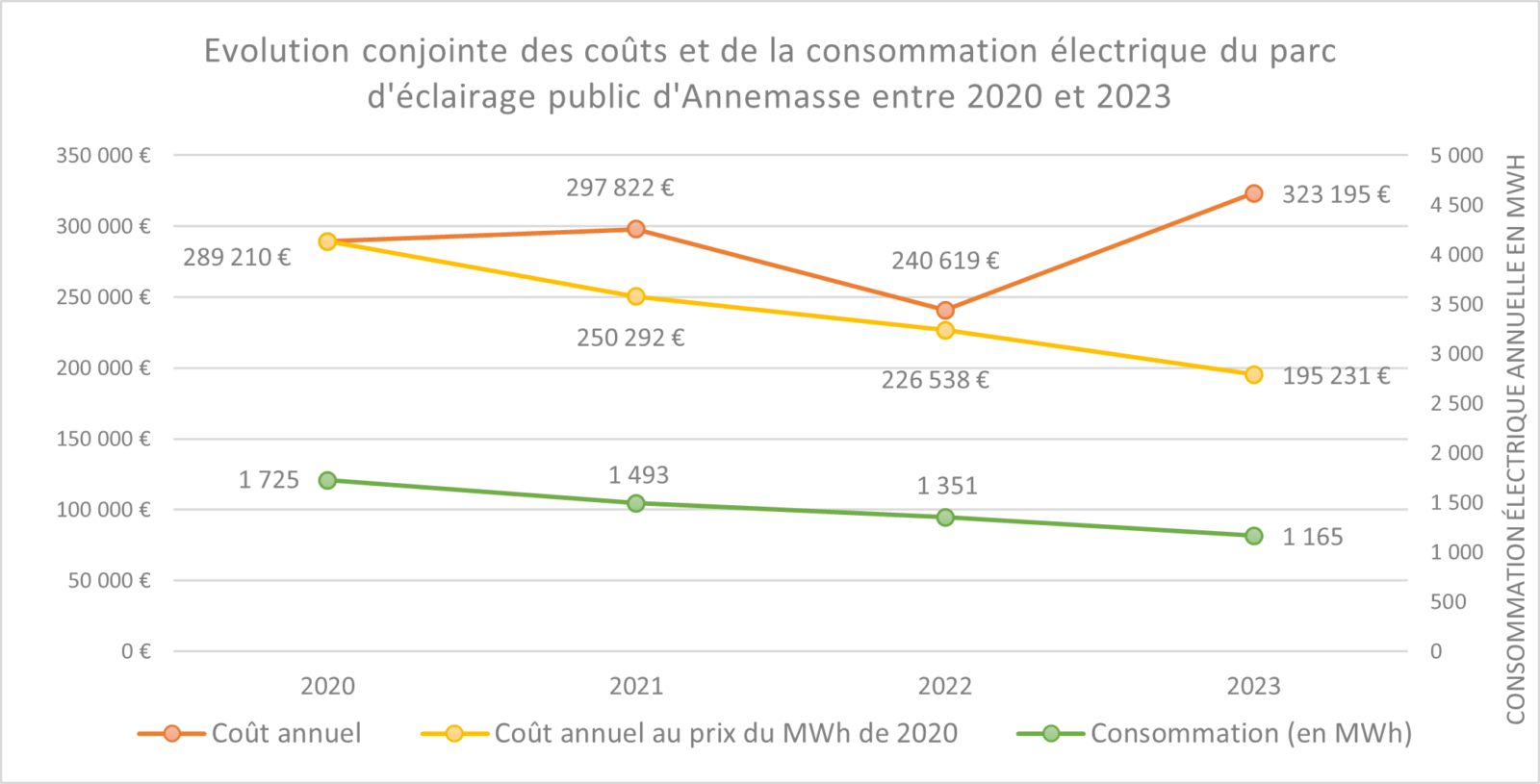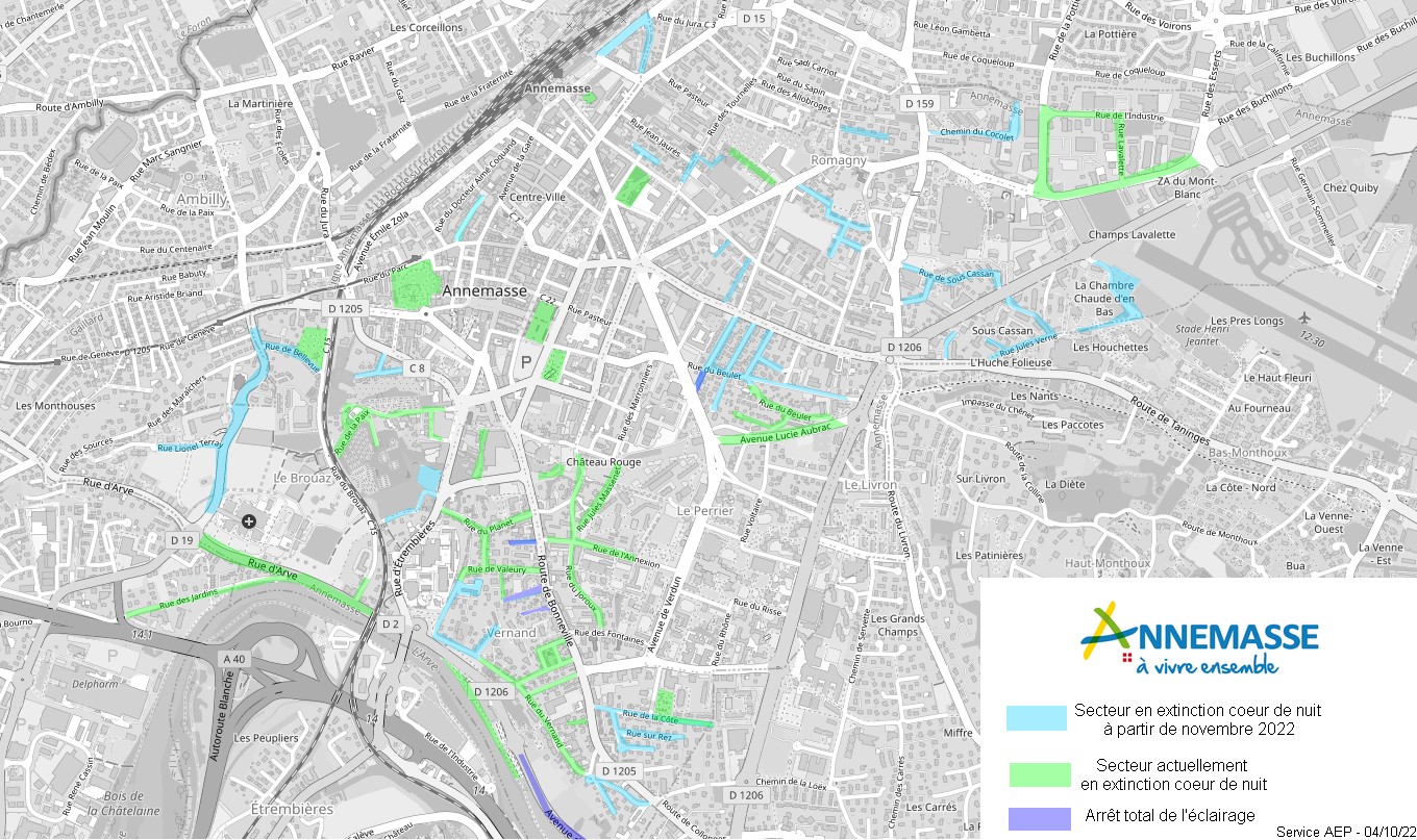 La commune d’Annemasse prête, depuis le début des années 2000, une attention particulière aux enjeux de développement durable, qui s’est également traduite dans le domaine de l’éclairage public. Le réseau est géré en régie. La commune a adopté en 2009 une stratégie de renouvellement des candélabres et d’abaissement de l’intensité lumineuse en cœur de nuit, effectuée à chaque intervention sur le matériel. Épousant une forte volonté politique, les services aménagements des espaces publics et transition écologique travaillent en synergie afin de mettre en œuvre le plus efficacement possible la stratégie d’économie d’énergie et de réduction de la pollution lumineuse. L’extinction reste un sujet délicat pour les communes, puisqu’elle touche à des représentations en matière d’insécurité et de fréquentation de l’espace public. C’est pourquoi Annemasse a procédé à cette stratégie progressivement à partir de 2016, en débutant par ses espaces naturels et son corridor écologique (parcs, bords d’Arve) ainsi que la zone commerciale en périphérie, puis les cœurs d’îlots résidentiels, où il y a peu d’usages la nuit, puis en adaptant l’intensité et les plages où l’éclairage est allumé en fonction des usages. Pour déterminer quel site sera éteint ou allumé, et à quelle intensité lumineuse, deux facteurs entrent en jeu :