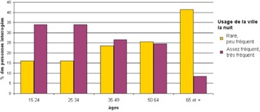« La ville la nuit : une appropriation inversée en fonction de l’âge ». Lamand (2006), d’après le sondage SOFRES « Les français et le temps dans la ville » de mai 2001.