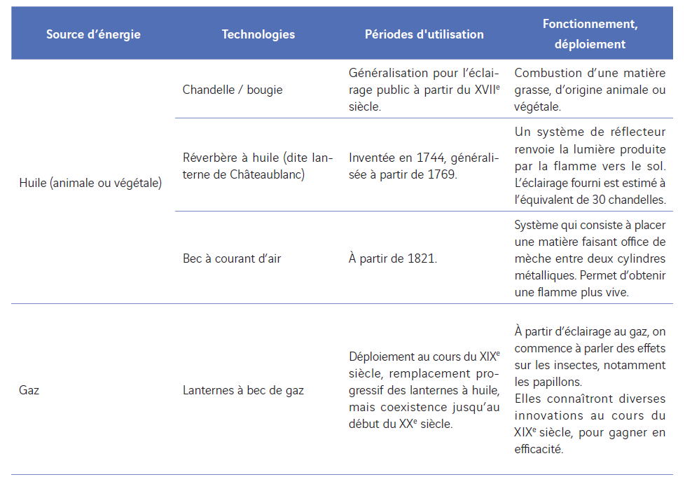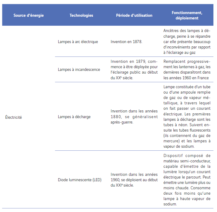On se base ici sur un document ressource produit par l’académie de Lyon65. Ce tableau parcourt dans les grandes lignes les différentes technologies et sources d’énergie qui ont été utilisées pour éclairer les villes.