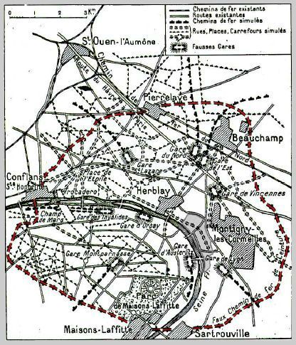 Pour tromper l’ennemi, l’ingénieur Fernand Jacopozzi, spécialiste des illuminations festives, propose de créer un jumeau lumineux de Paris, dans les boucles de la Seine pour détourner les attaques aériennes de la capitale. C’est ce qu’on appelle le projet de la réplique de Paris, qui a débuté en 1917. Ce « faux Paris » devait se trouver le long de la forêt de Saint-Germain-en-Laye, autour des villes de Maisons- Laffitte, Herblay et Conflans-Sainte-Honorine. Ce projet n’a jamais servi, puisque les premières installations furent achevées en septembre 1918, deux mois avant l’Armistice. Il ne reste aujourd’hui aucune trace de ces installations.
