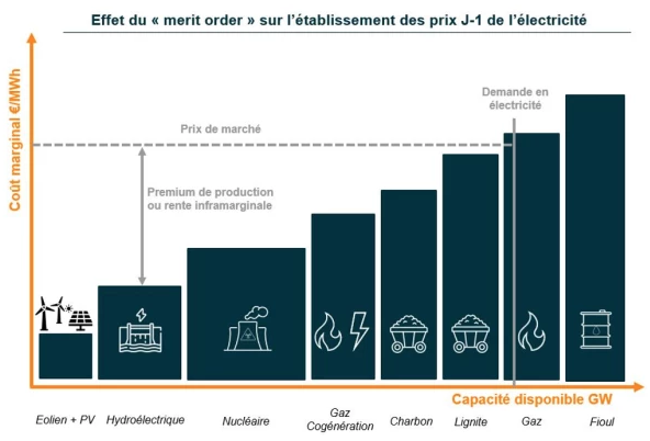 Ils représentent 20 % des produits échangés à l’échelle européenne17. Les centrales appelées en premier sont celles dont les coûts de production sont les plus bas (en tenant compte des effets incitatifs et désincitatifs du système d’échange de quotas carbone). C’est un système de paiement au prix marginal, qui incite les producteurs à réduire au maximum leur prix de vente, pour être « appelés » le plus souvent possible ; c’est ce qu’on appelle le « merit order » (ordre de préséance économique) (cf. figure ci-dessous). En fonction de la demande, les prix du marché spot peuvent être indexés sur les prix du nucléaire, du charbon, du gaz, du fioul. Les prix de l’électricité sur le marché spot sont donc très volatiles et fortement soumis à des événements conjoncturels.