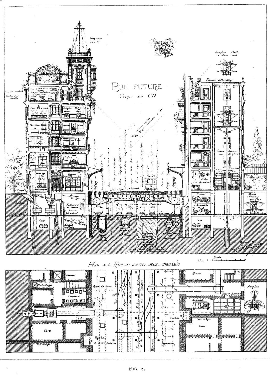 Dans les années 1900, Eugène Hénard propose dans Études sur les transformations de Paris14 des rues à étages multiples dans lesquelles les circulations urbaines se font sous la surface.