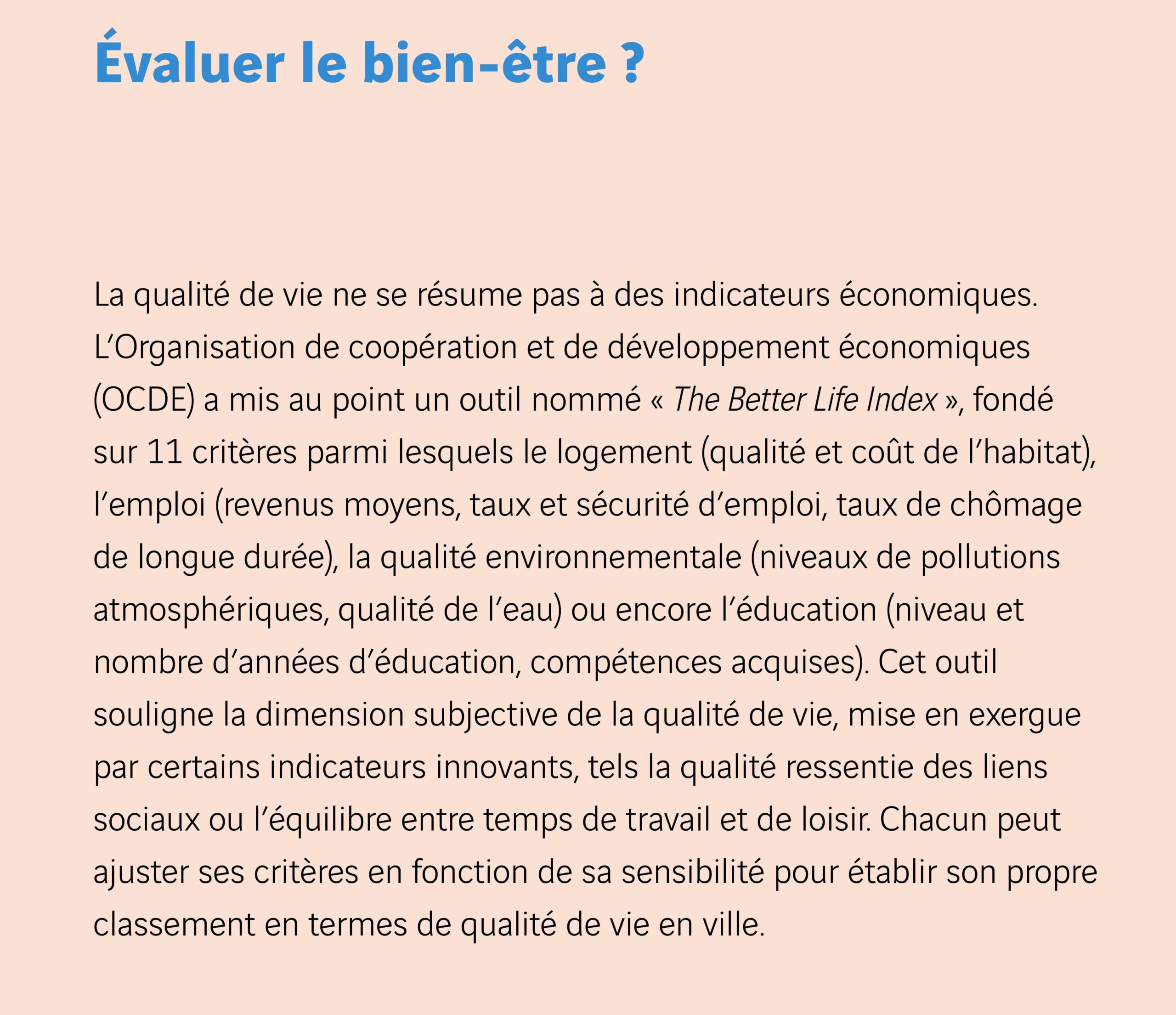 C’est pourquoi l’OCDE a également fait évoluer ses instruments de mesure. « L’approche par le PIB par habitant et l’argument de la croissance forte ont leurs limites », affirme ainsi Aziza Akhmouch. Ces limites sont de deux ordres : d’une part, ces indicateurs ignorent le point de vue du citoyen (argument commun avec Mercer) ; d’autre part, ils ne disent rien de l’impact environnemental et social des politiques menées, ni de l’appropriation réelle des infrastructures mises à disposition : donner le nombre de routes ou d’hôpitaux indique un potentiel mais ne dit rien de qui peut y avoir accès ni de la qualité du service dispensé par ces infrastructures. Pour comprendre si tous les habitants peuvent avoir accès à une meilleure qualité de vie et sous quelles conditions, l’OCDE a mis au point un Better Life Index. Celui-ci innove non seulement en mettant en lumière les disparités sociales éventuelles et en introduisant des critères faisant appel à la subjectivité de chacun (la qualité ressentie des liens sociaux, l’équilibre entre temps de travail et de loisir…) mais aussi en permettant à chacun de pondérer les différents indicateurs en fonction de sa propre conception de la qualité de vie afin d’obtenir un classement personnalisé des villes. Cette approche prend donc congé d’une certaine vision universaliste de la qualité de vie. La qualité de vie apparaît en effet être le résultat d’une combinaison de trois conceptions distinctes et complémentaires1 :