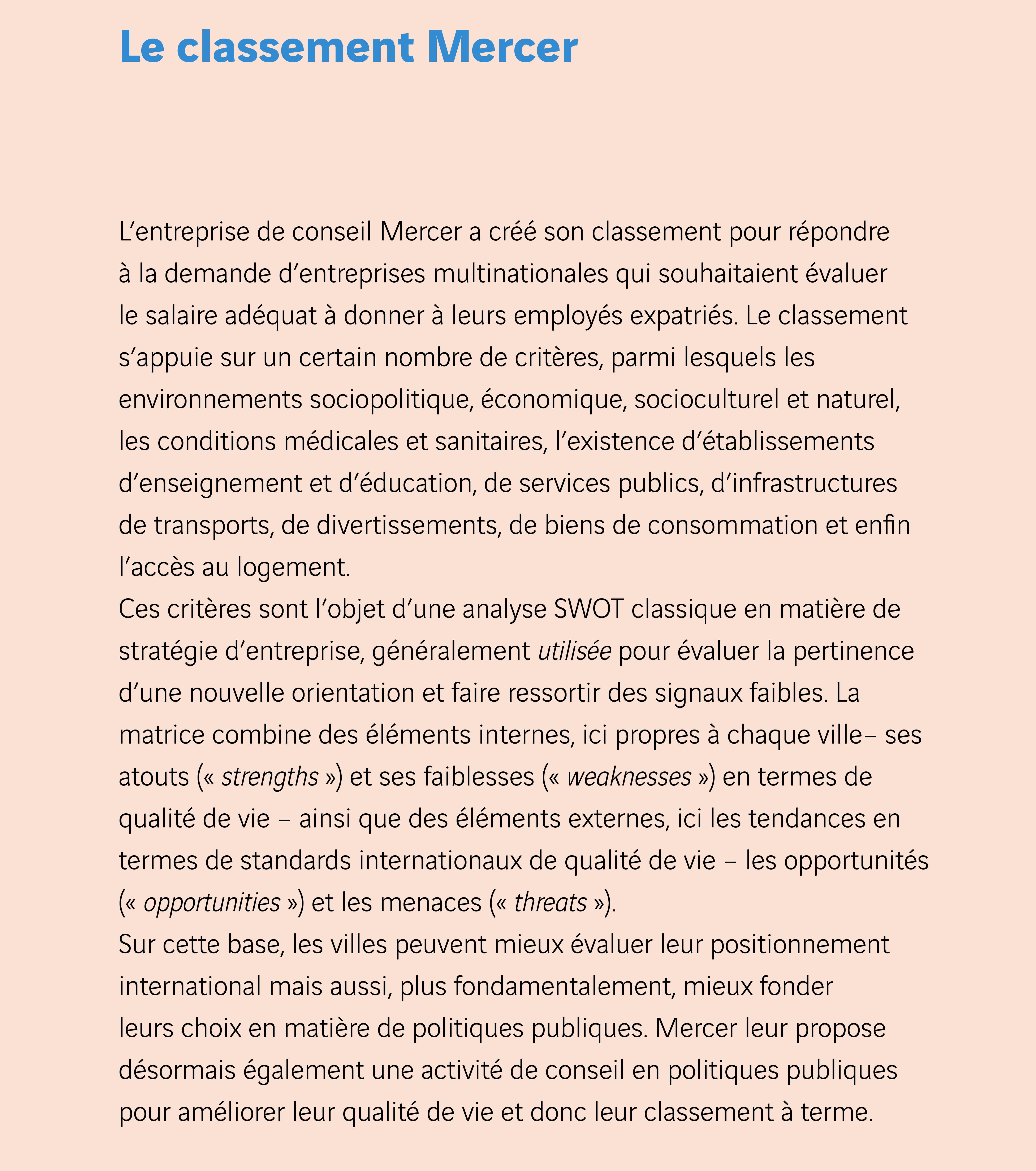 Les classements portant sur la qualité de vie servent de plus en plus souvent d’outils d’orientation des politiques publiques. Comme l’explique Slagin Parakatil, ils peuvent jouer un rôle de stimulus auprès des pouvoirs publics, auxquels le classement Mercer renvoie une image « miroir » de leur ville sous la forme d’une évaluation extérieure de son fonctionnement. Il met en exergue les forces et faiblesses des différentes villes au regard des tendances régissant les standards internationaux de la qualité de vie. La force du classement établi par Mercer est sa constance d’année en année : celle-ci lui permet d’établir une comparaison fiable dans le temps sur la base des mêmes indicateurs, de constater les évolutions positives ou les altérations de la qualité de vie et ainsi d’évaluer l’impact des politiques menées. Le classement Mercer est devenu un véritable point de référence pour les acteurs tant publics que privés, si bien que le cabinet a développé, en plus de son offre aux entreprises, une offre de conseil en direction des collectivités. L’impact des classements dépasse donc leurs objectifs premiers et ceux-ci se révèlent d’e?llents instruments pour le développement économique des villes, qui s’en servent d’abord comme un levier puissant de marketing territorial pour attirer les talents. Thomas Madreiter, responsable de l’aménagement à la municipalité de Vienne, le confirme : « les villes se font aujourd’hui concurrence à l’échelle mondiale pour attirer les meilleurs cerveaux, les meilleures entreprises et les meilleurs chercheurs…. Le classement Mercer est donc très important car il permet à Vienne d’avoir une forte visibilité à l’international et d’être attractive ». Les villes voient également dans les classements un outil pour renforcer chez les habitants un sentiment positif d’appartenance et de fierté qui cimente la communauté. Toutefois, tout classement repose sur une comparaison – et toute comparaison, pour être correctement utilisée, exige que l’on soit conscient de ses limites : que compare-t-on et jusqu’à quel point la comparaison vaut-elle ?