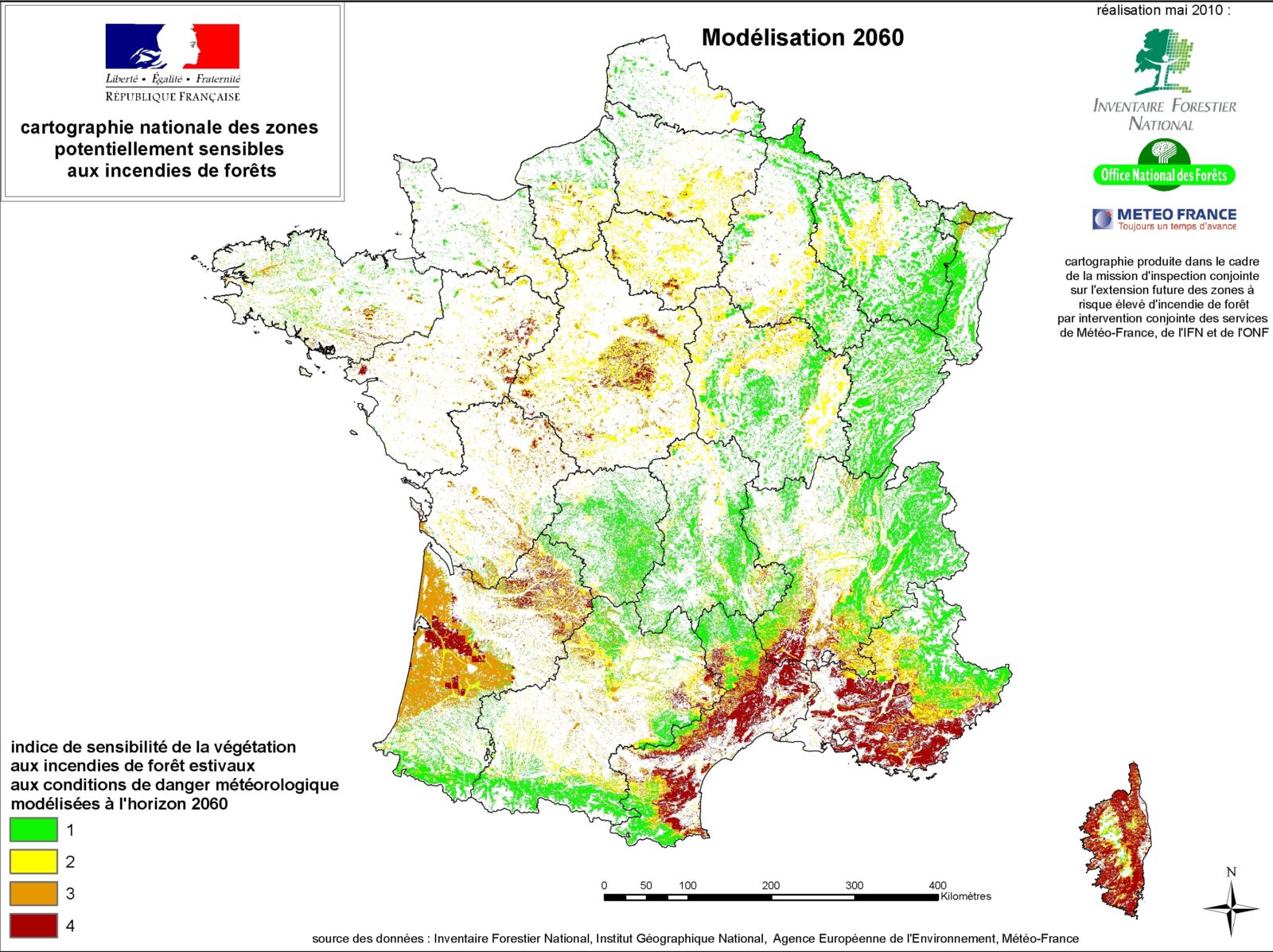 Vers 2040, les conditions de l’été 2003 (état de sécheresse sur tout le territoire dès le mois de mars, canicules en juin, vagues de chaleur d’une durée de 10 jours en août) pourraient se reproduire tous les 4 ans dans les territoires méditerranéens10 . Également, alors qu’en 2010, 33 % des landes et forêts du territoire français présentaient un niveau élevé d’exposition à ce risque, en 2050, près de 50 % pourraient être concernées.
