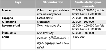 Maintenir un rapport de proportionnalité et tenir compte de la taille du maillage de découpage de l’espace sont deux facteurs prépondérants qui expliquent la diversité des définitions et des seuils statistiques des « villes moyennes » selon les pays, en Europe comme dans le reste du monde. En raison de cette diversité de nature, les enjeux rencontrés par les villes moyennes françaises et leurs homologues étrangères ne peuvent être les mêmes.