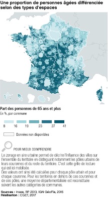 La carte de France fait apparaître des situations très inégales en matière de vieillissement, tributaires, entre autres, de la densité de population et de la localisation géographique. Ainsi, les territoires les moins denses (en vert sur la carte ci-dessous) abritent une importante proportion de personnes âgées « mais ne vieilliront plus », explique l’Observatoire des territoires ; « l’enjeu principal y sera le problème de l’isolement12 » des personnes âgées. À l’inverse, « le périurbain des années 1970 (en bleu sur la carte) est jeune et va connaître au moins ponctuellement un vieillissement marqué13 ». Ainsi, la part des plus de 65 ans va d’ores et déjà croissant dans « certaines métropoles ou grandes villes (Paris, Nantes, Rennes, Montpellier, Orléans, etc.), et surtout les couronnes périurbaines des grandes agglomérations du pays (Île-de-France, régions lyonnaise et nantaise, etc.)14 ».